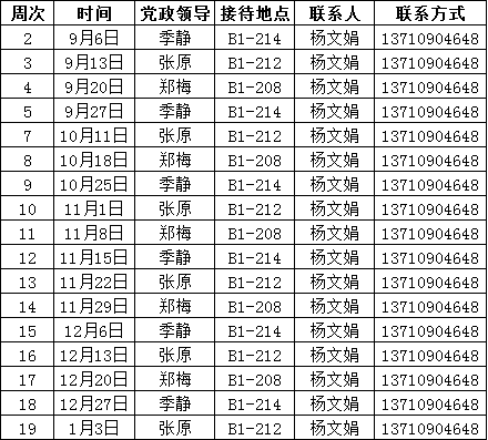 为畅通公司与师生员工的联系渠道,面对面听取师生对公司工作的意见和建议,妥善解决师生群众反映的问题,现就本学期公司党政领导接待日安排如下:
