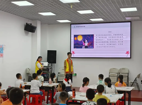 由志愿者王津通过结合事先精心准备的ppt,围绕中秋节的由来、中秋节的风俗、中秋节的诗词朗诵三个部分,为现场的小朋友进行中秋节文化习俗的简单介绍。在讲解前,王津事先做好充足准备,在讲解中积极与小朋友进行互动,吸引小朋友们的注意,让他们在愉快的畅听中了解中秋节的传统习俗及文化传承。现场小朋友们反馈活跃,积极思考,也很礼貌的举手补充志愿者同学讲解的遗漏。举办如此有意义的活动,相信会让所有小朋友对中国传统节日中秋节有更加深刻的认知。