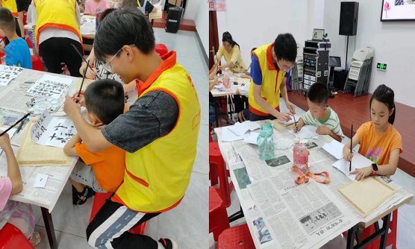 活动即将结束,在志愿者的提醒下,还没完成的小朋友加快了速度,正待完善的小朋友也更加认真起来了,最后在书法老师发出结束指令的同时,所有小朋友都放下了沾满墨汁的笔,在书法老师及志愿者的指引下,小朋友们带着他们全神贯注写下的书法作品走到前台合影,每位小朋友的脸上都洋溢着满足的笑容。